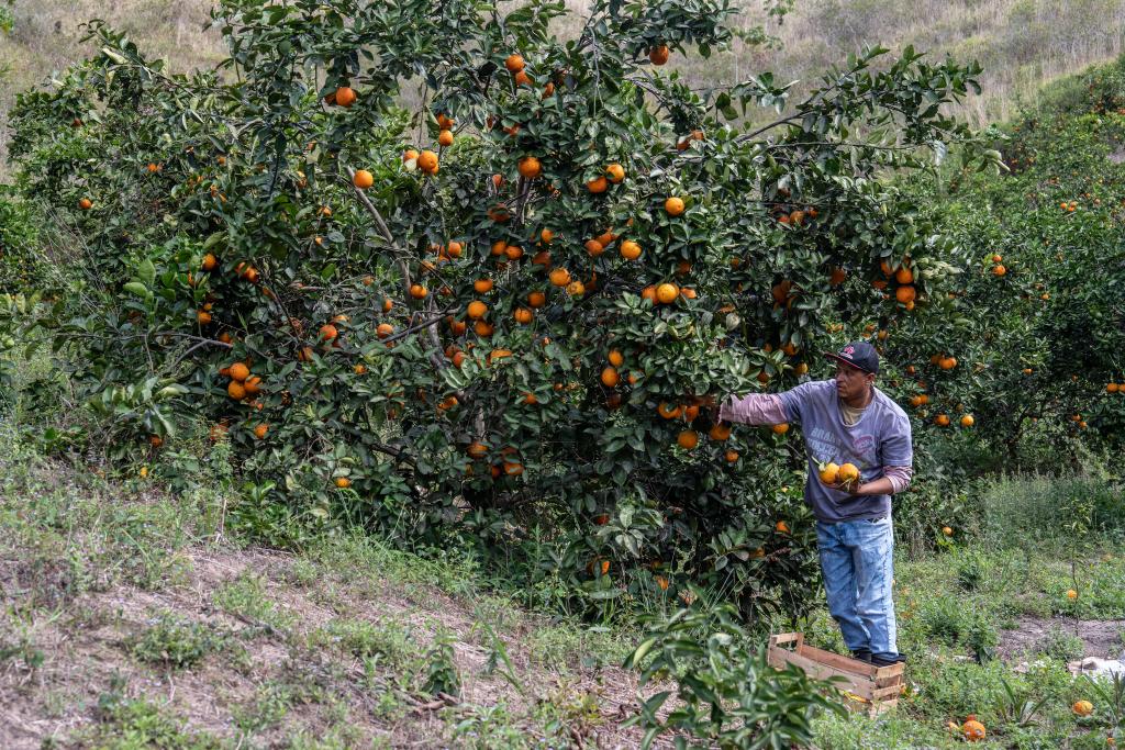 8月19日,在巴西里约热内卢州坦瓜市,一名橙农采摘橙子。每年8月至9月,巴西各地橙园进入收获季节。巴西是全球最大的橙汁生产国和出口国之一,在国际市场上占有重要地位,其产品远销世界各地。新华社记者王天聪摄